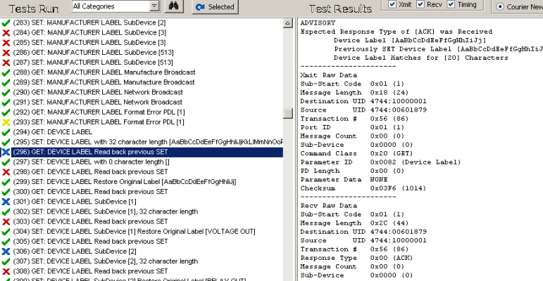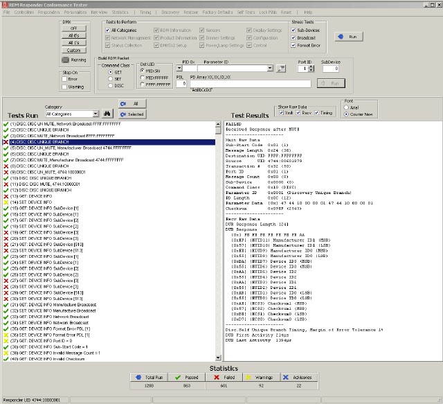 The RDM Responder Conformance Test is a Windows Application that performs tests on products claiming compliance with the ANSI E1.20 -2010 [Remote Device Management over DMX512 Networks] and ANSI E1.37-1 [Additional Message Sets for ANSI E1.20 (RDM) – Part 1, Dimmer Message Sets] standards and seeks to evaluate a product's compliance with those documents.